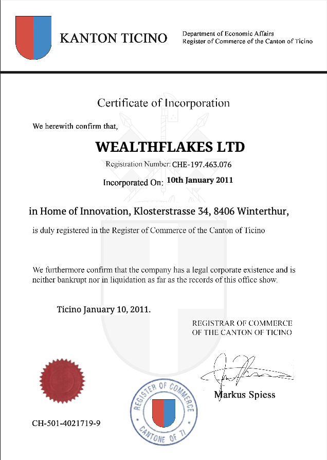 Wealthflakes company registered in Switzerland companies office registration number: CHE-197.463.076. Wealthflakes firm focused on assets trading and other financial activities such as stocks and bonds since january 10, 2011.